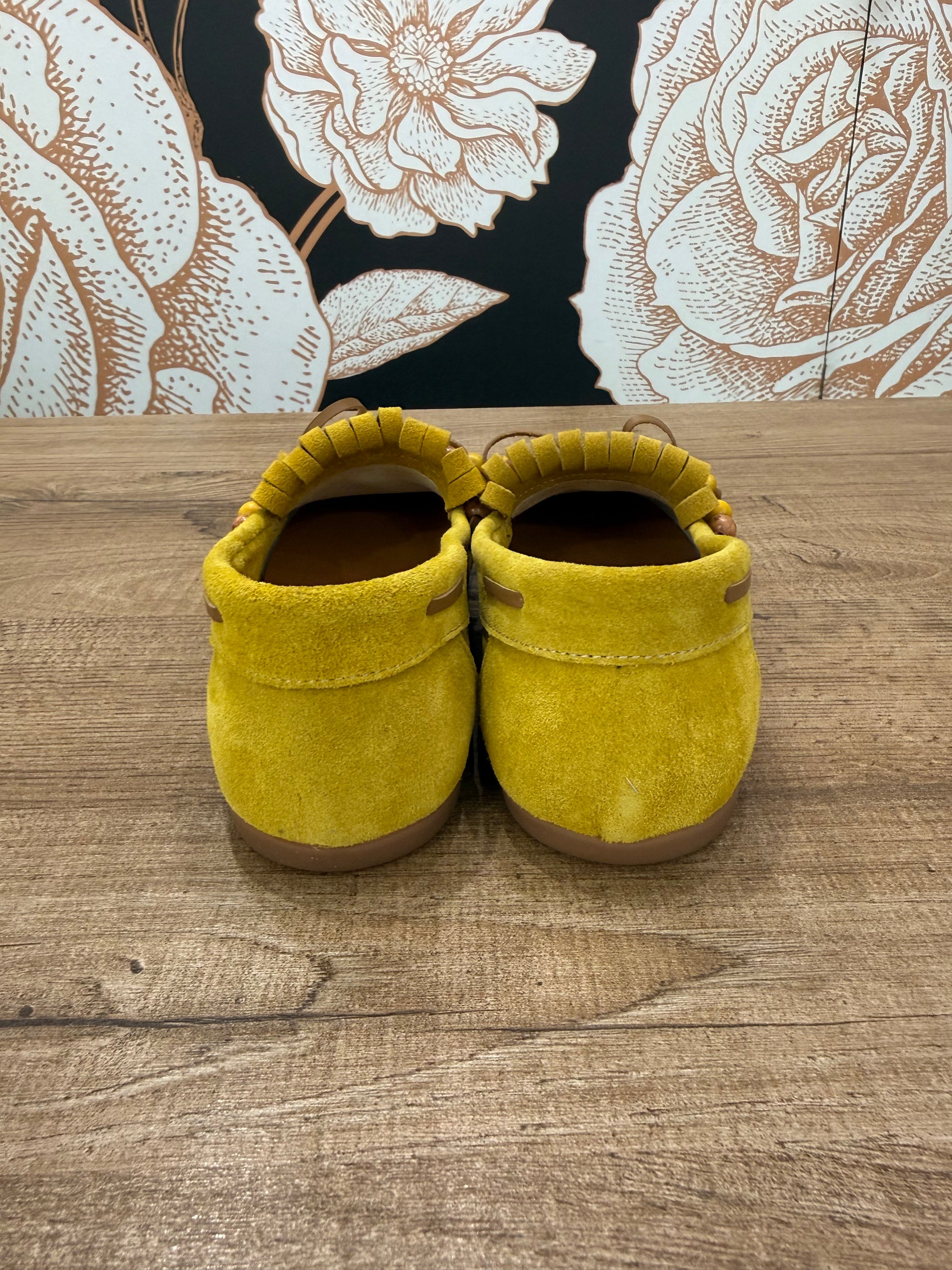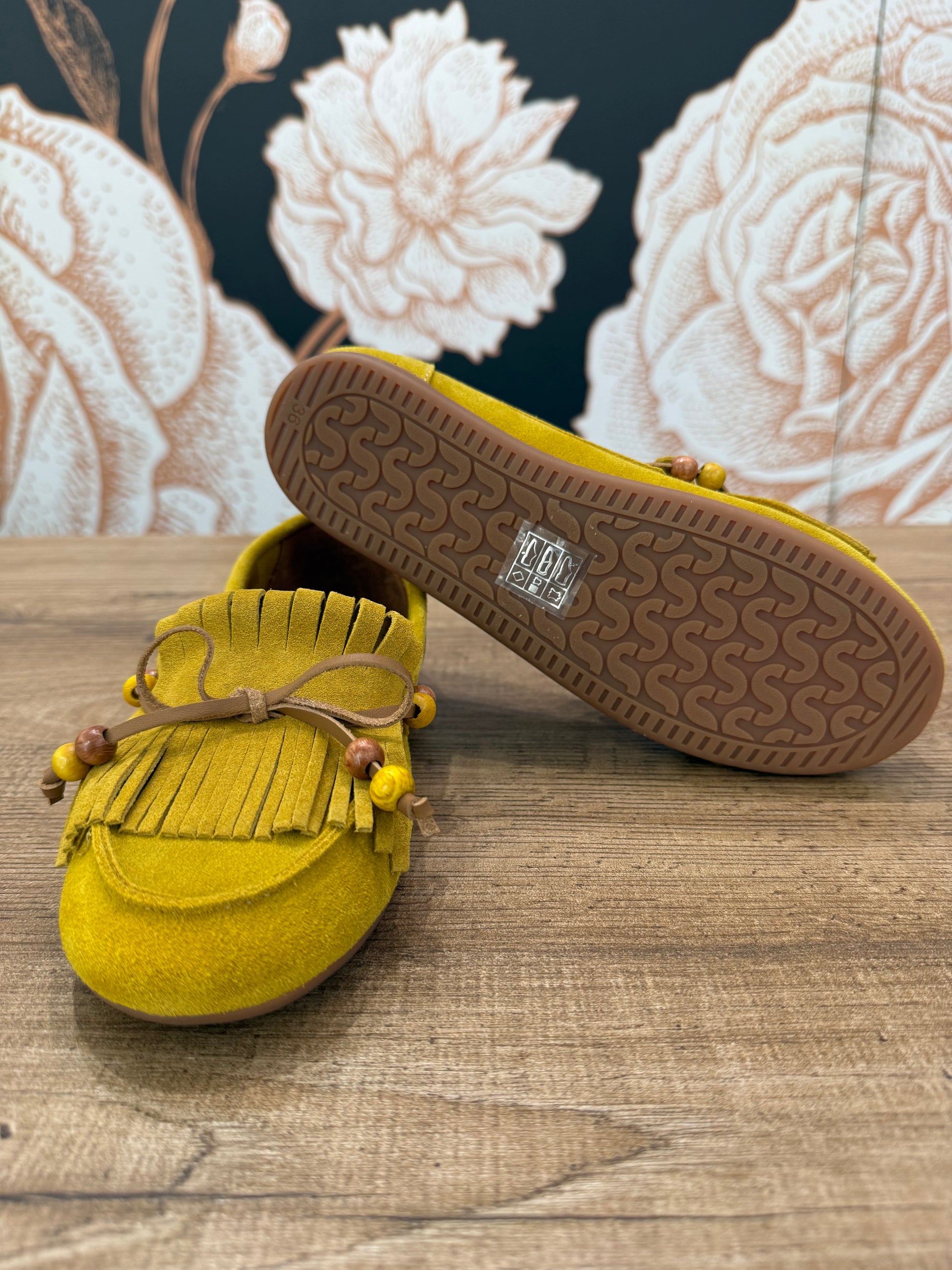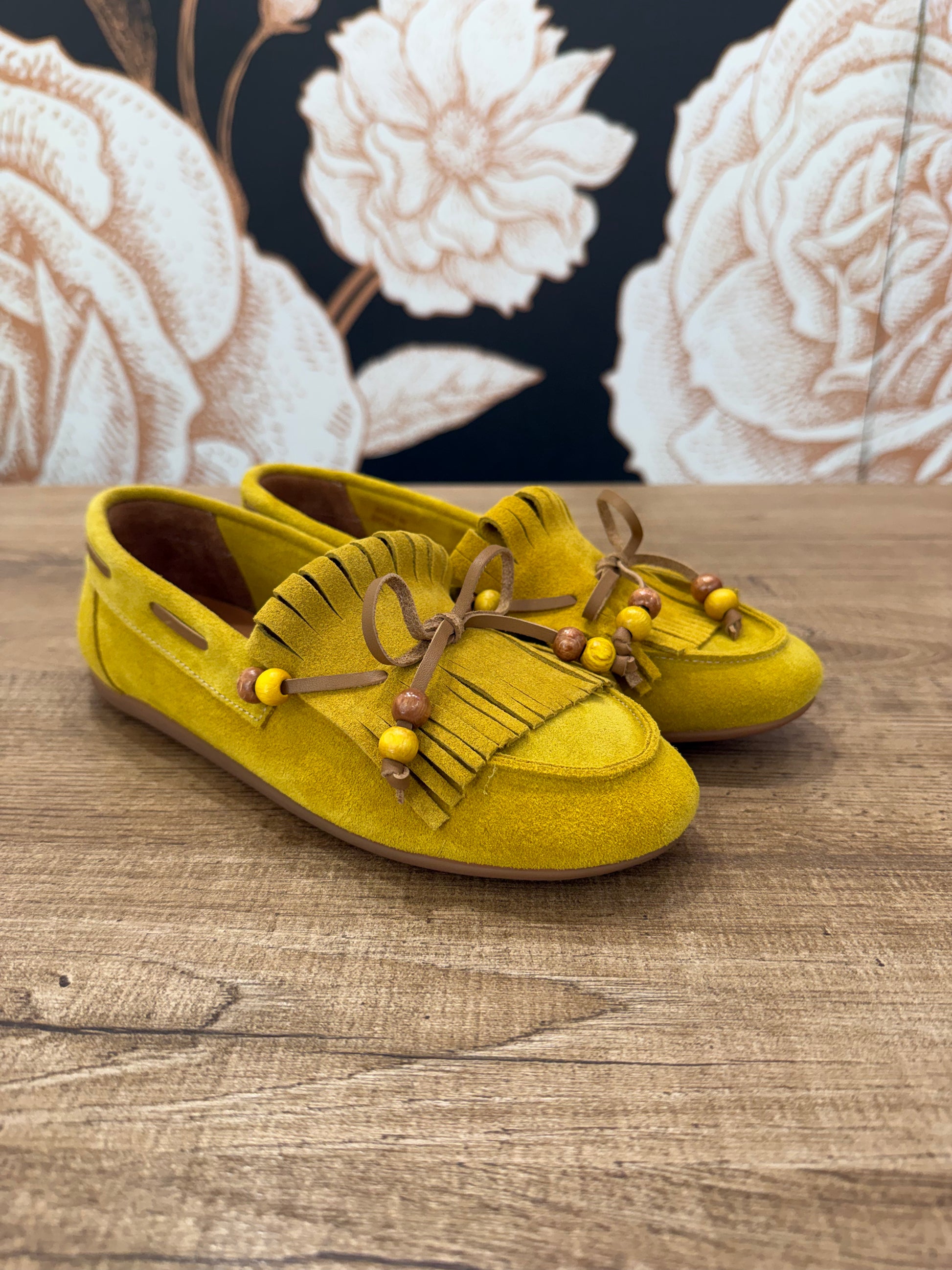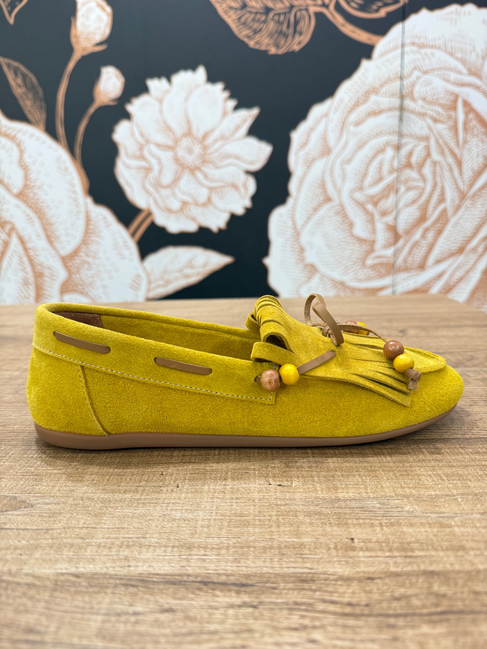Mocassino in camoscio con frange e perline decorative. Vivace e originale è realizzato in morbido camoscio, ideale per dare carattere a qualsiasi outfit. Il design è impreziosito d frange frontali, laccetto in tono e perline decorative. La suola flessibile e leggera assicura comfort per tutto il giorno. Pefetto per look casual chic.