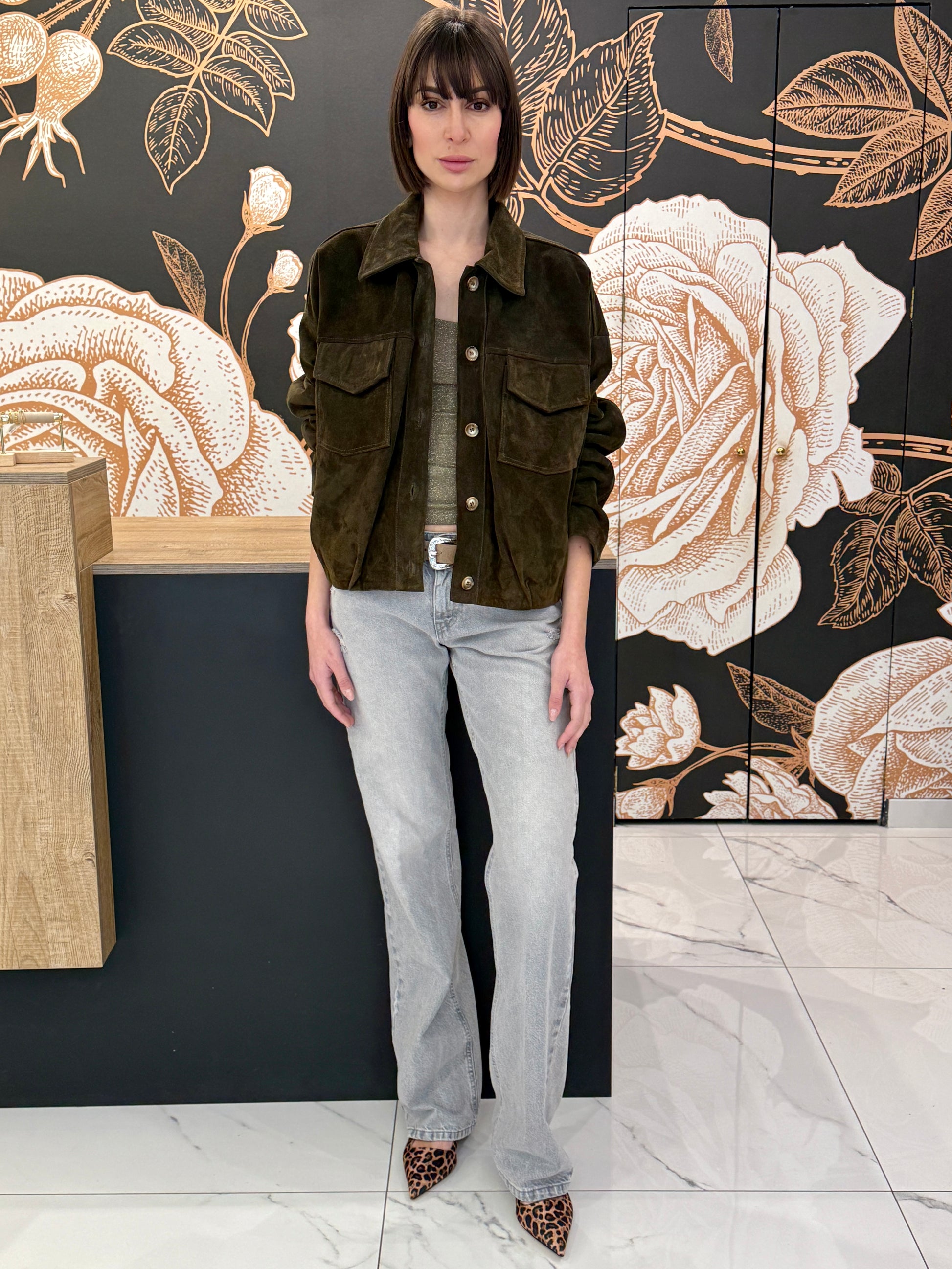 Questa giacca modello bomber in crosta color verde bosco presenta un'estetica sofisticata e contemporanea. Realizzata in crosta dalla texture morbida e vellutata, silhouettes leggermente boxy e rilassata con volumi morbidi. Ampio collo classico strutturato, abbottonatura frontale con bottoni a vista, due tasche applicate sul petto con pattina dal carattere funzionale. Coulisse sul retro per un ottima vestibilità. Il colore esalta il carattere naturale della pelle scamosciata rendendo il capo facile da abbinare con denim chiari e toni neutri. Composizione 100% vera pelle