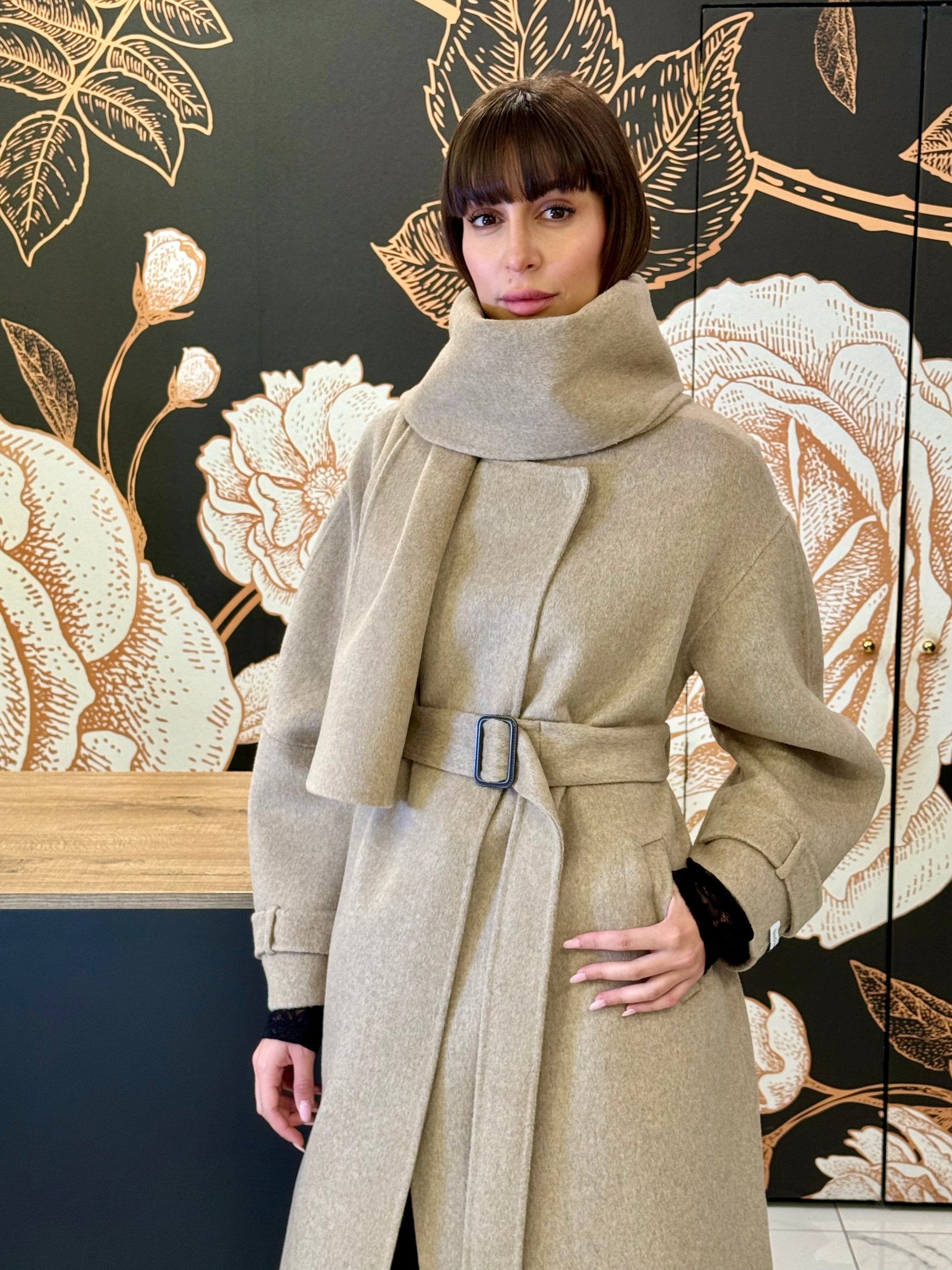 Questo cappotto hand made, realizzato artigianalmente con cura, si distingue per diversi dettagli: la cintura che valorizza la silhouette e per la sciarpa/scialle inclusa, rimovibile per diverse possibilità di styling. La chiusura con bottoni a clip nascosti garantisce una linea pulita e raffinata, mentre le tasche laterali offrono praticità senza rinunciare all’eleganza. Un capo versatile e sofisticato, perfetto per affrontare la stagione con classe.
