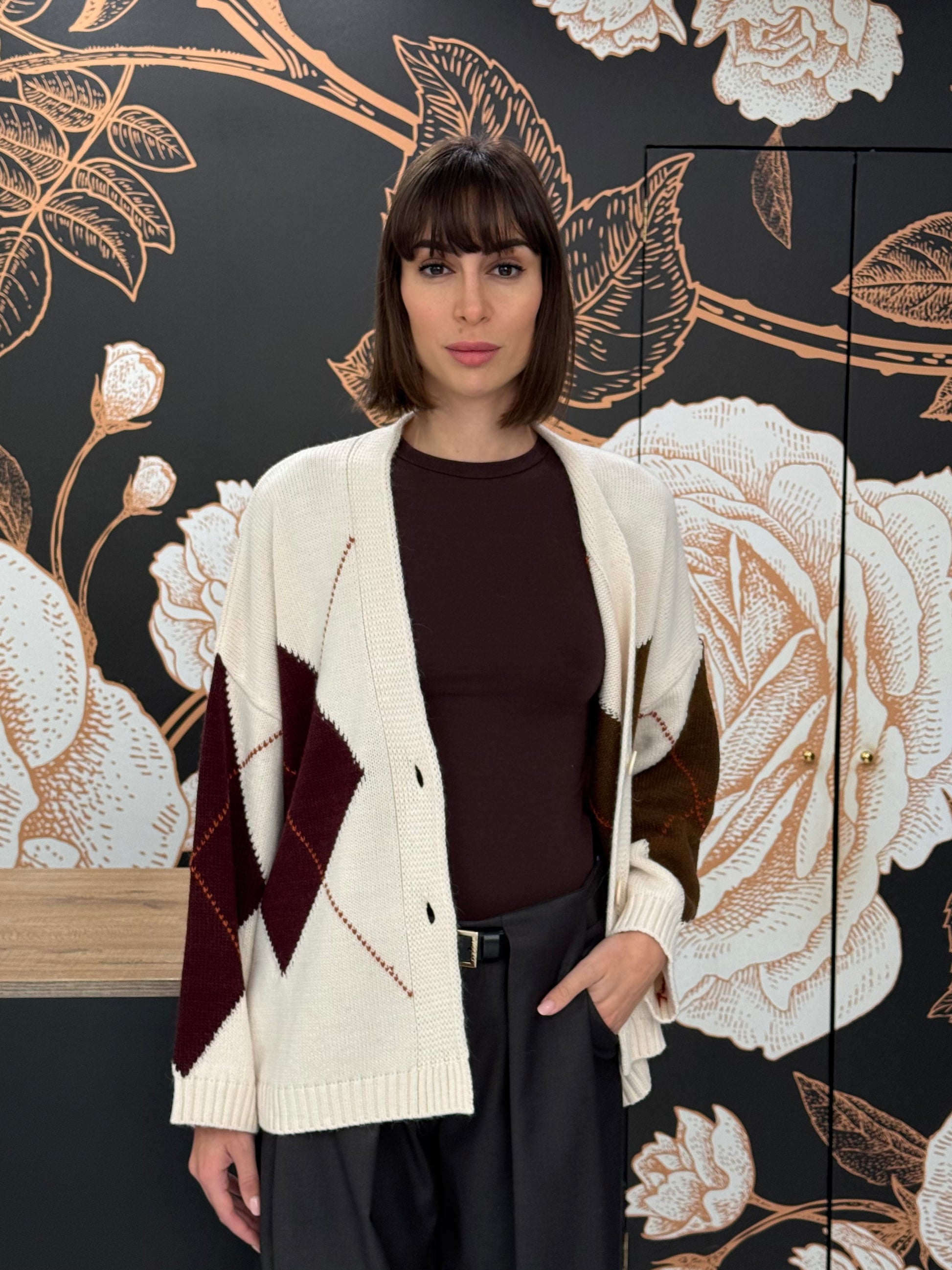 Cardigan oversize a rombi color burro, moka e coccio di Haveone. Modello a tre bottoni con manica a ampia e fondo a costine.