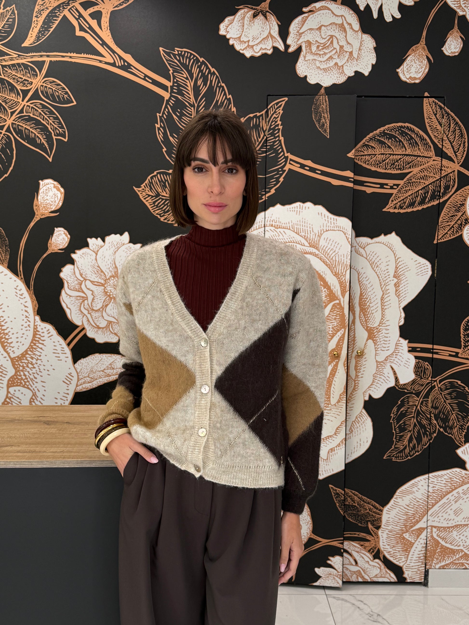 Cardigan fantasia rombi in mohair. fili di lurex donano luce e carattere, chiusura con 4 bottoni madreperla. Vestibilità morbida