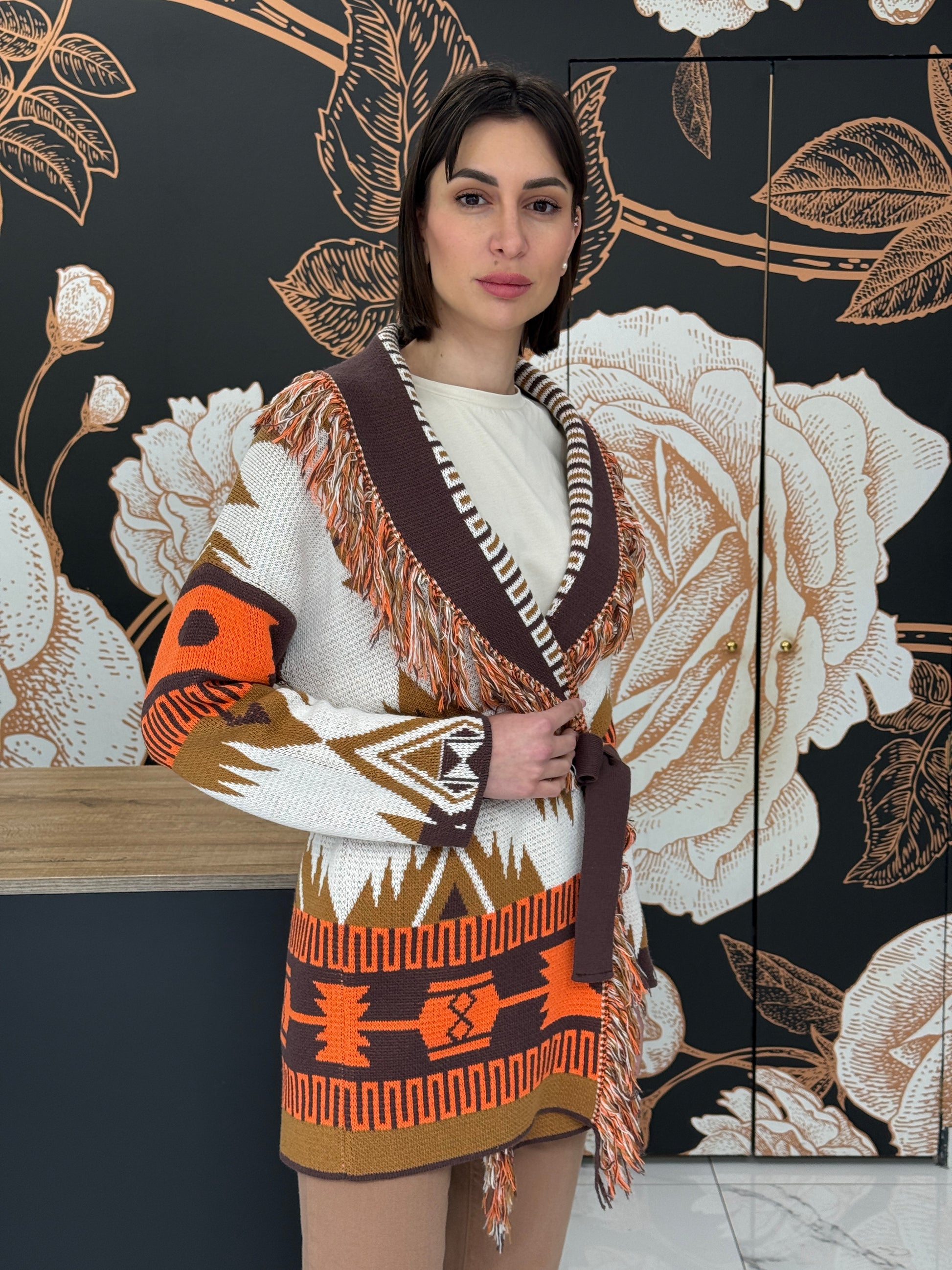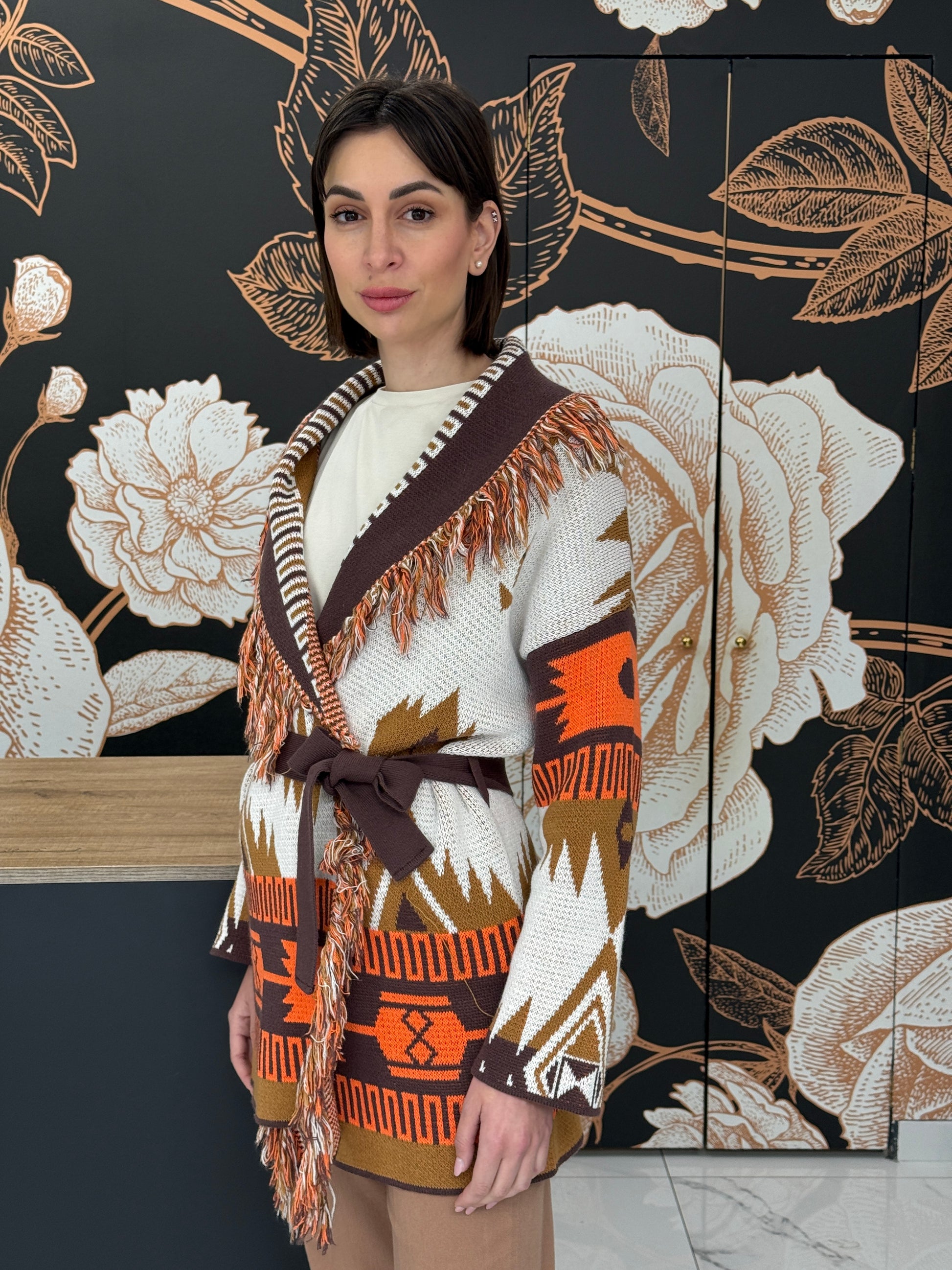 Cardigan jacquard frange marrone - Vicolo