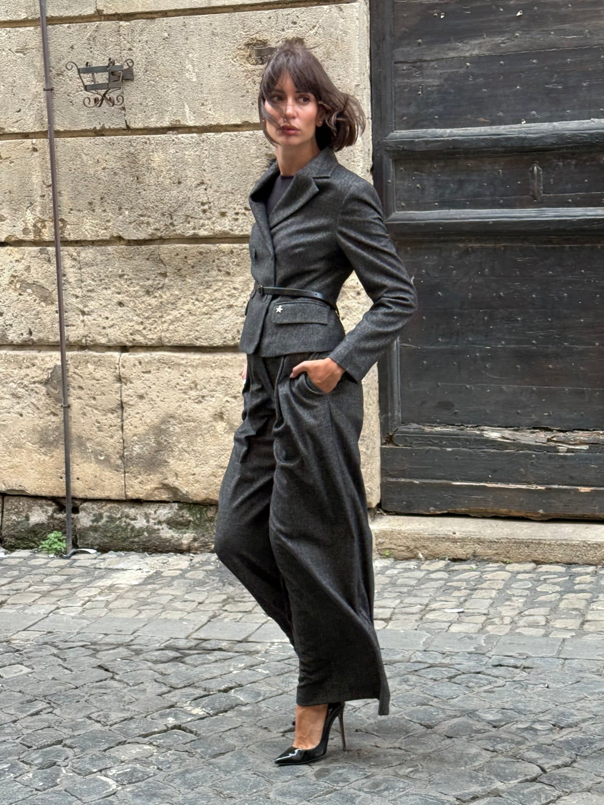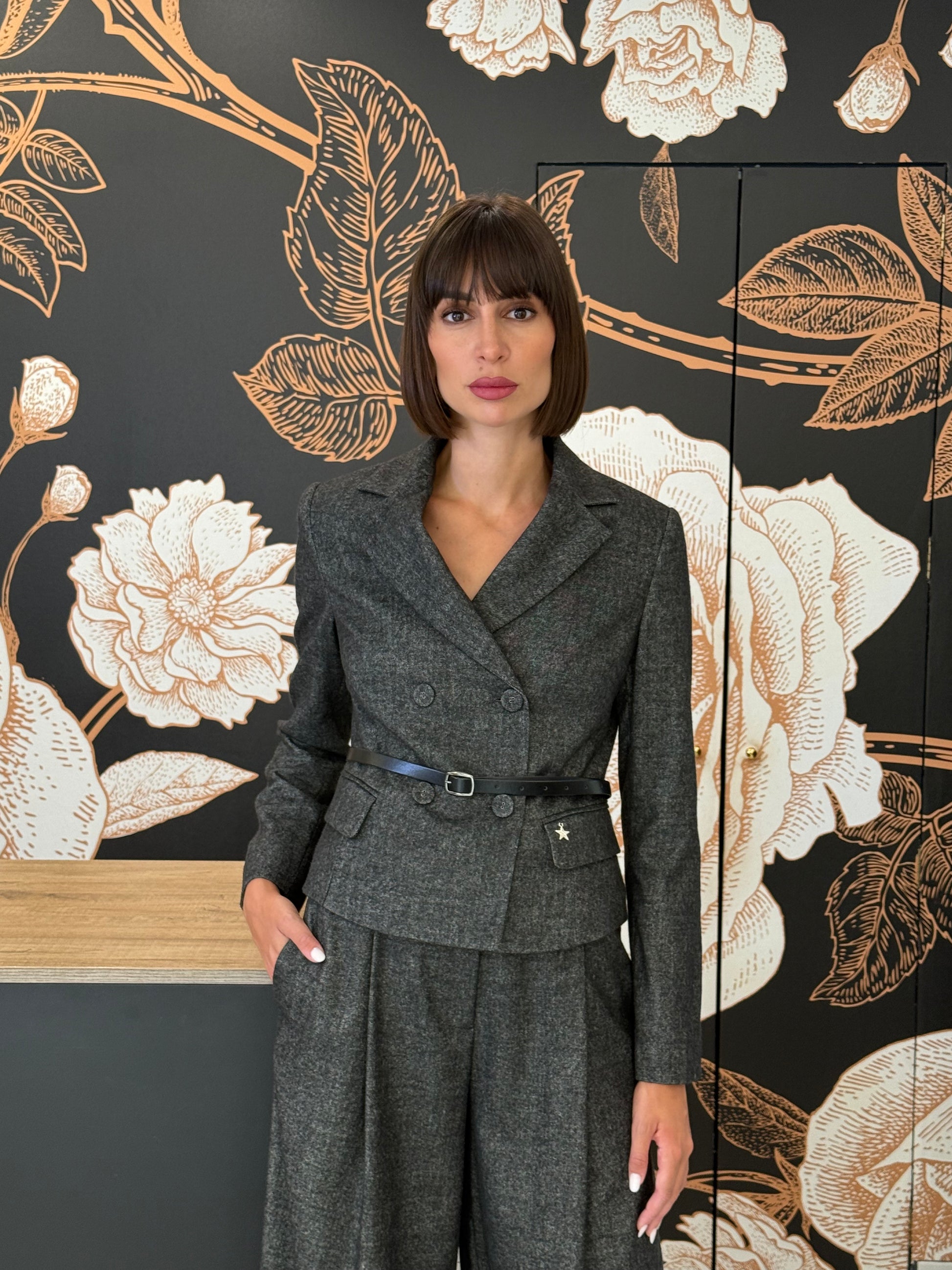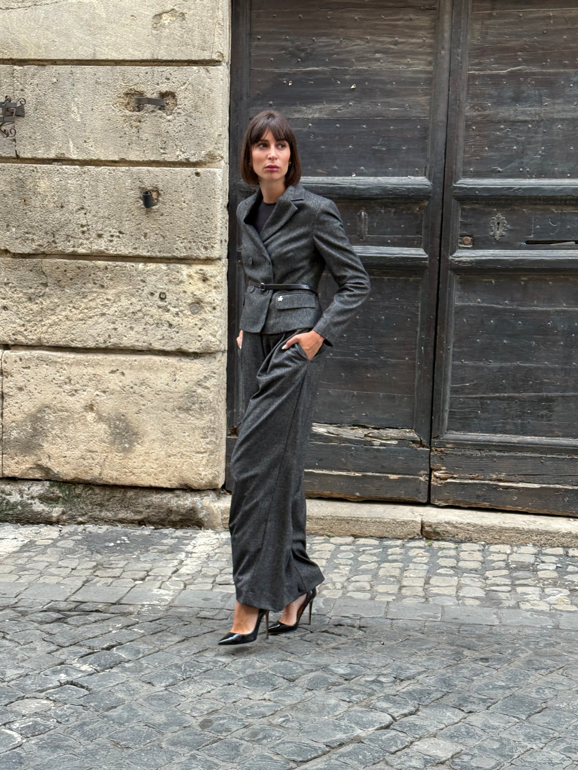 Completo antracite composto da giacca doppiopetto crop con cintura in punto vita e tasche con pattina. Il pantalone è a vita alta, gamba palazzo e pinces.