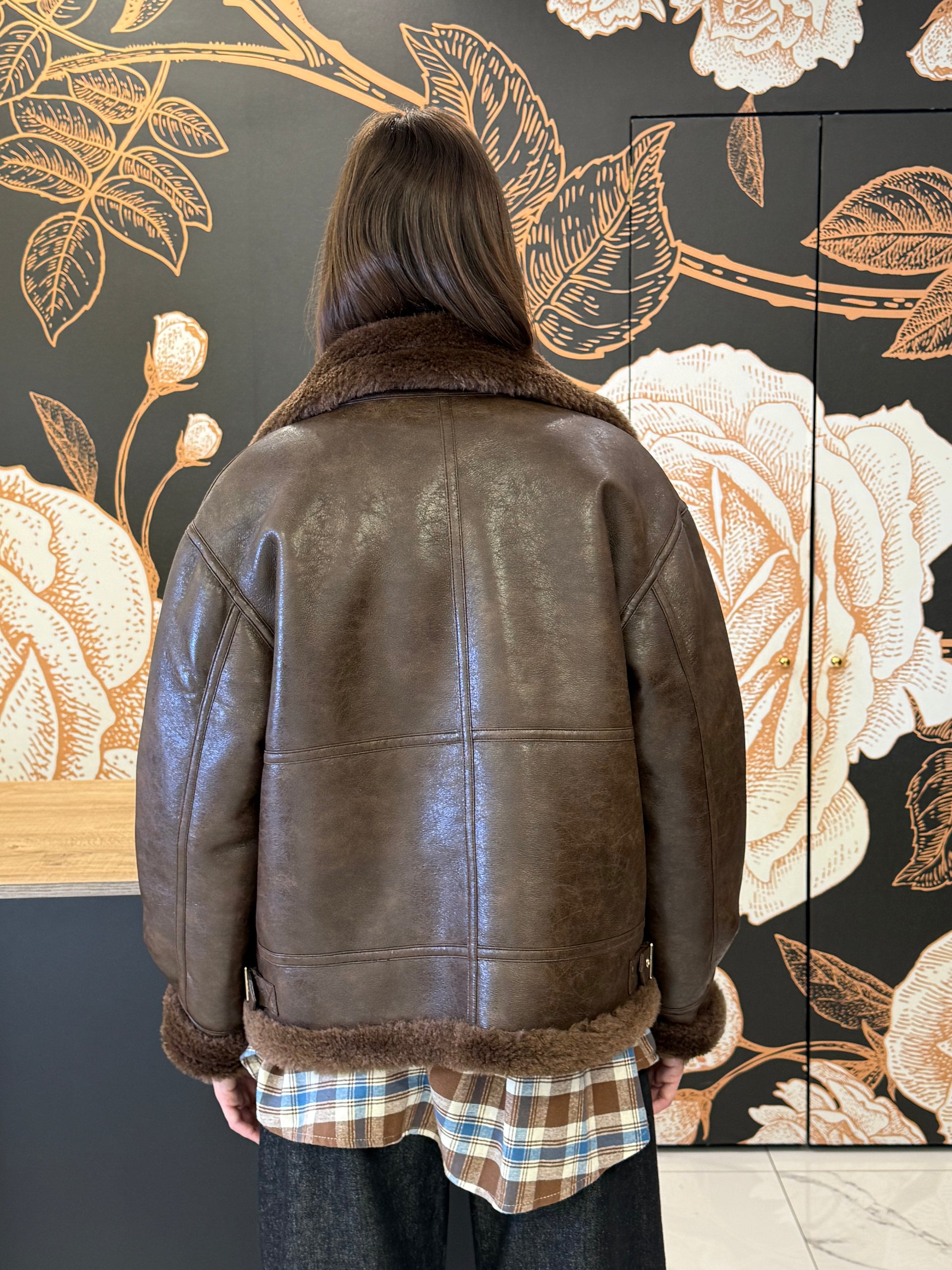 Un capospalla dal fascino intramontabile reinterpretato in chiave contemporanea. Questo ecomontone modello biker effetto pelle si distingue per la sua texture morbida e calda, con interno in ecopelliccia tono su tono che assicurano comfort nelle giornate piu fredde. Chiusura frontale con zip nascosta, collo ampio con bordo in pelliccia per un look avvolgente, due tasche a filo laterali. Vestibilità over. Fibbie regolabili laterali, dettagli color oro.