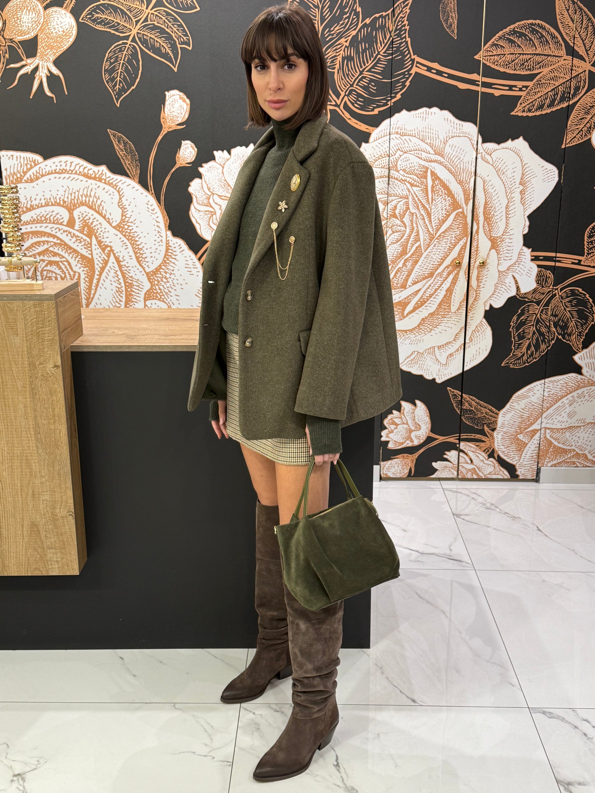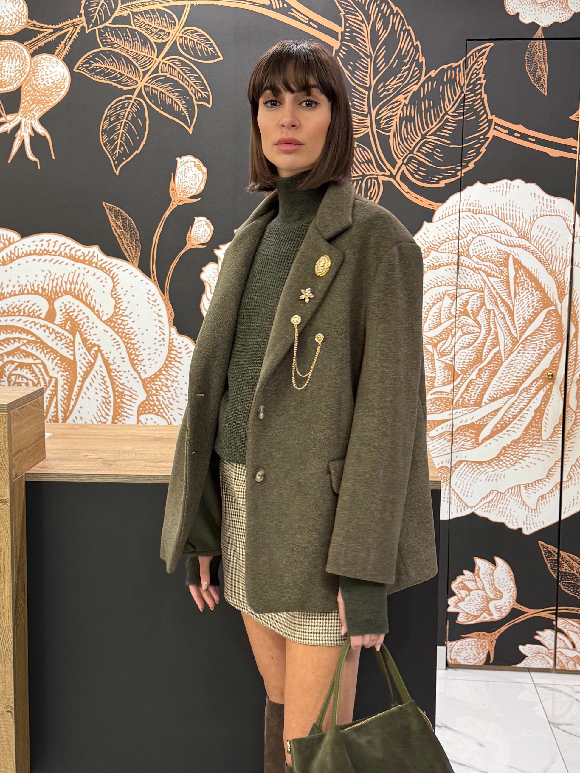 Giacca/Cappotto over con bavero decorato da spille, foderato internamente. Chiusura a due bottoni e tasche frontali. Linea ampia e contemporanea per un look sofisticato e di carattere. Dettaglio spille color oro rimovibili.