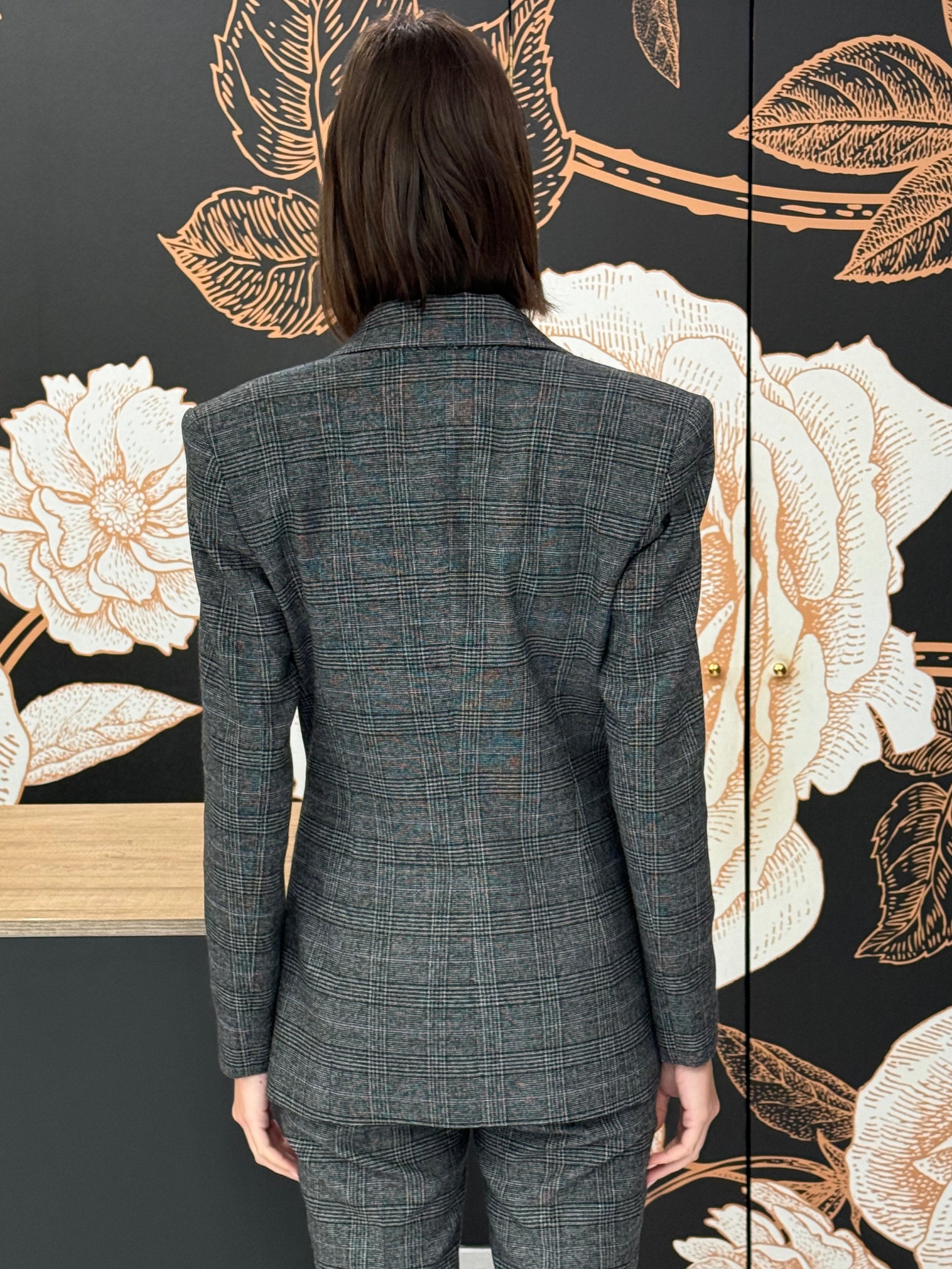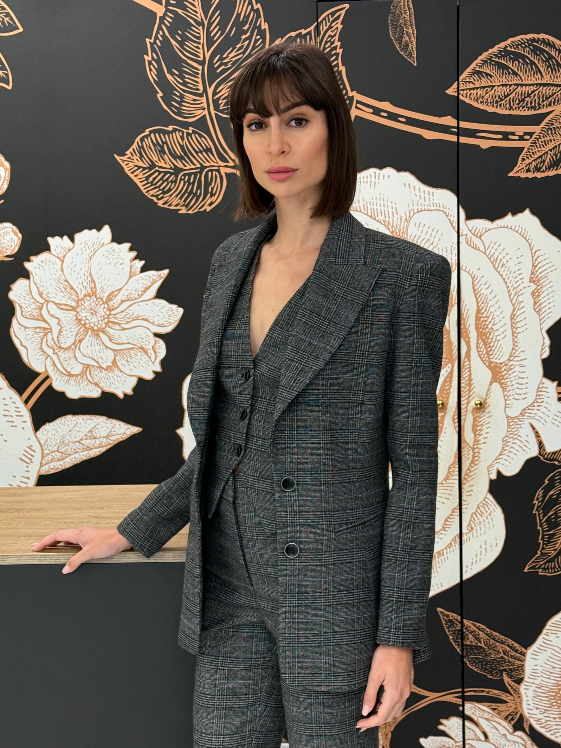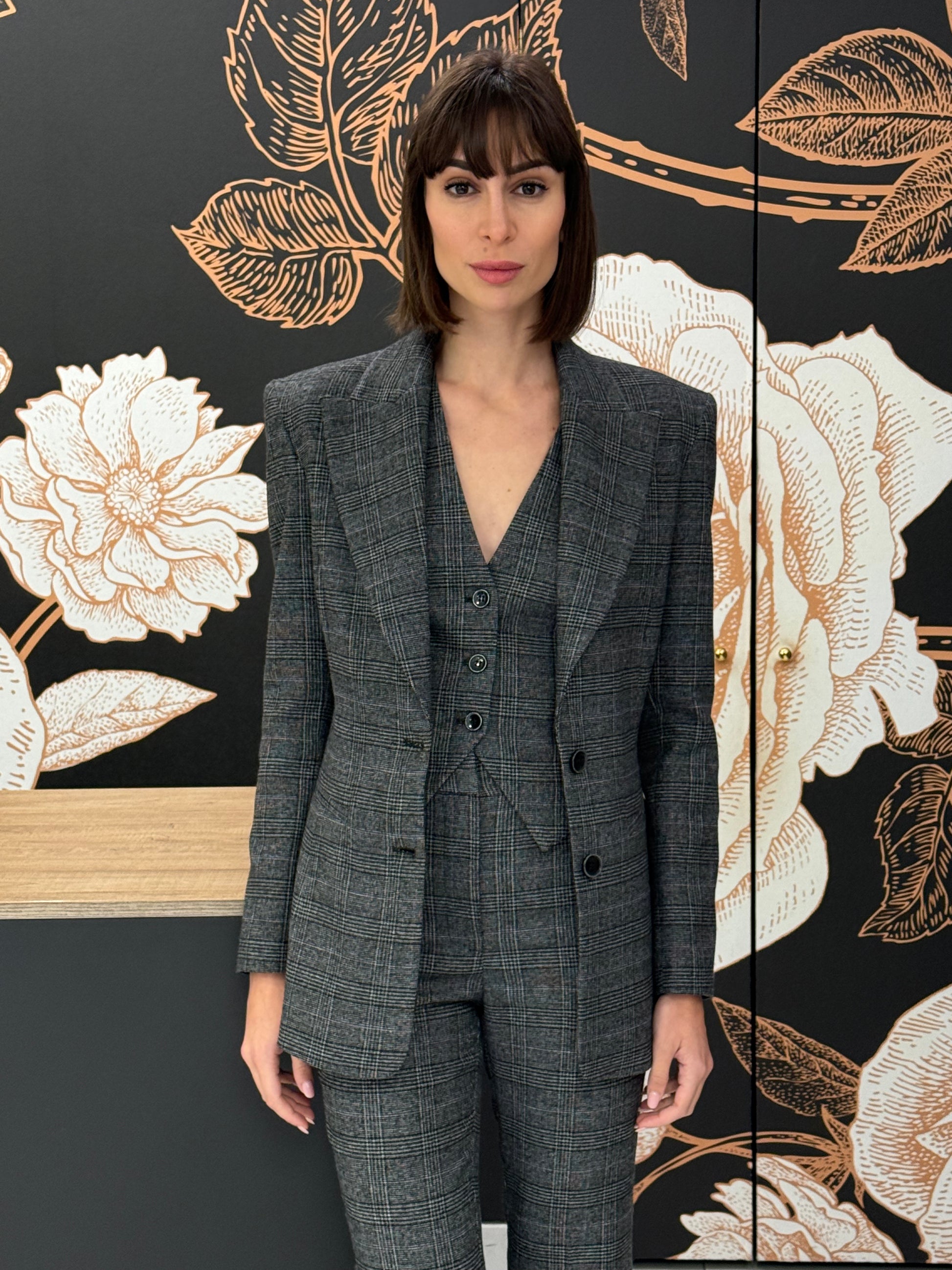 Elegante e contemporanea, questa blazer dal taglio sartoriale è realizzata in tessuto Galles, un classico intramontabile reinterpretato in chiave moderna. La linea strutturata valorizza la silhouette, mentre le spalle leggermente accentuate e la chiusura a due bottoni conferiscono un’allure decisa e raffinata. Perfetta per completare look da ufficio o outfit più casual chic. Blazer in tessuto Galles, chiusura frontale con due bottoni, revers classico,tasche a filetto, vestibilità: regular/slim fit. Spalline strutturate ,Interamente foderato.