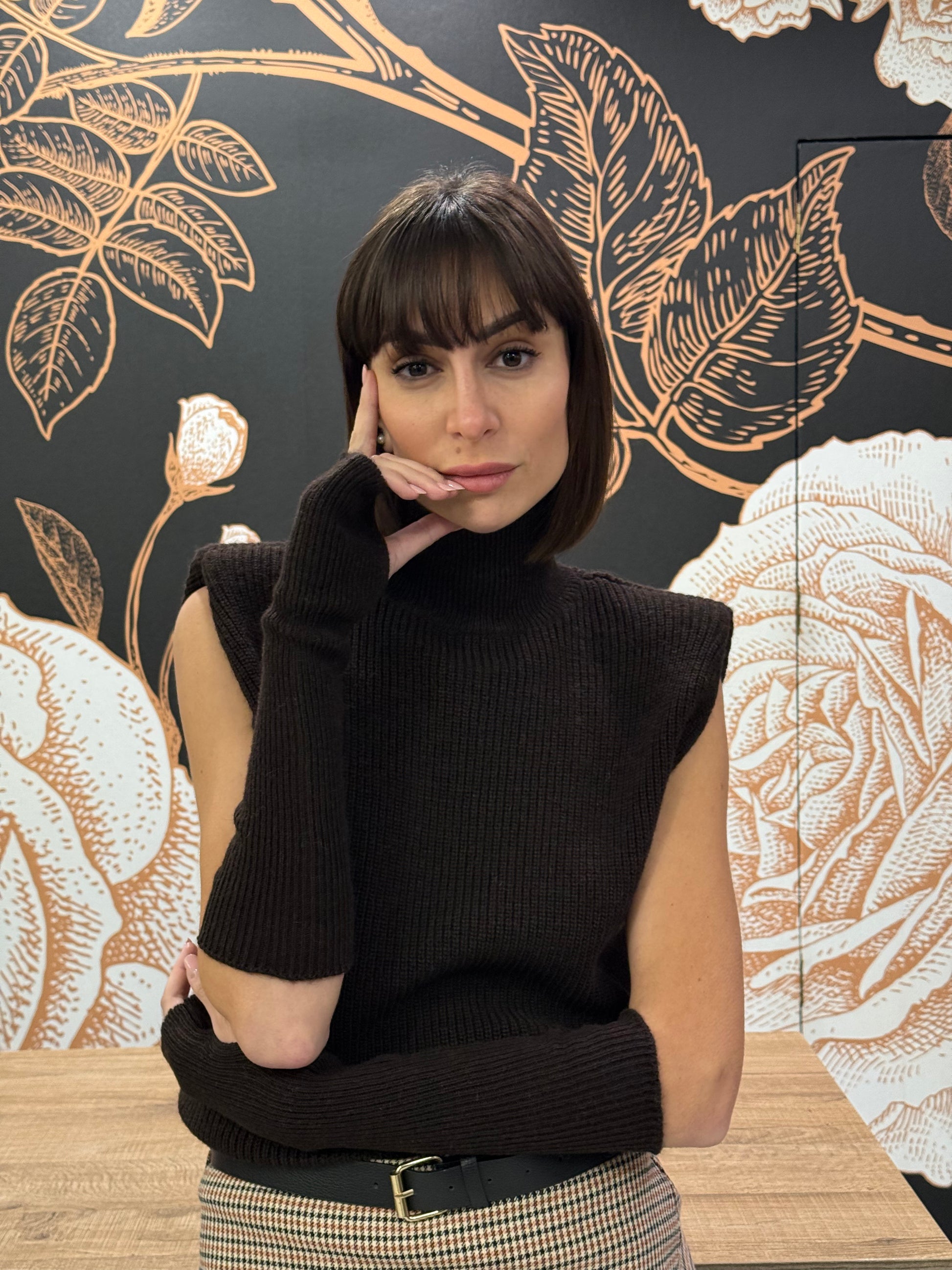 Gilet color marrone misto lana Kontatto. Modello collo alto smanicato con spalle imbottite. Dettaglio di manicotti.