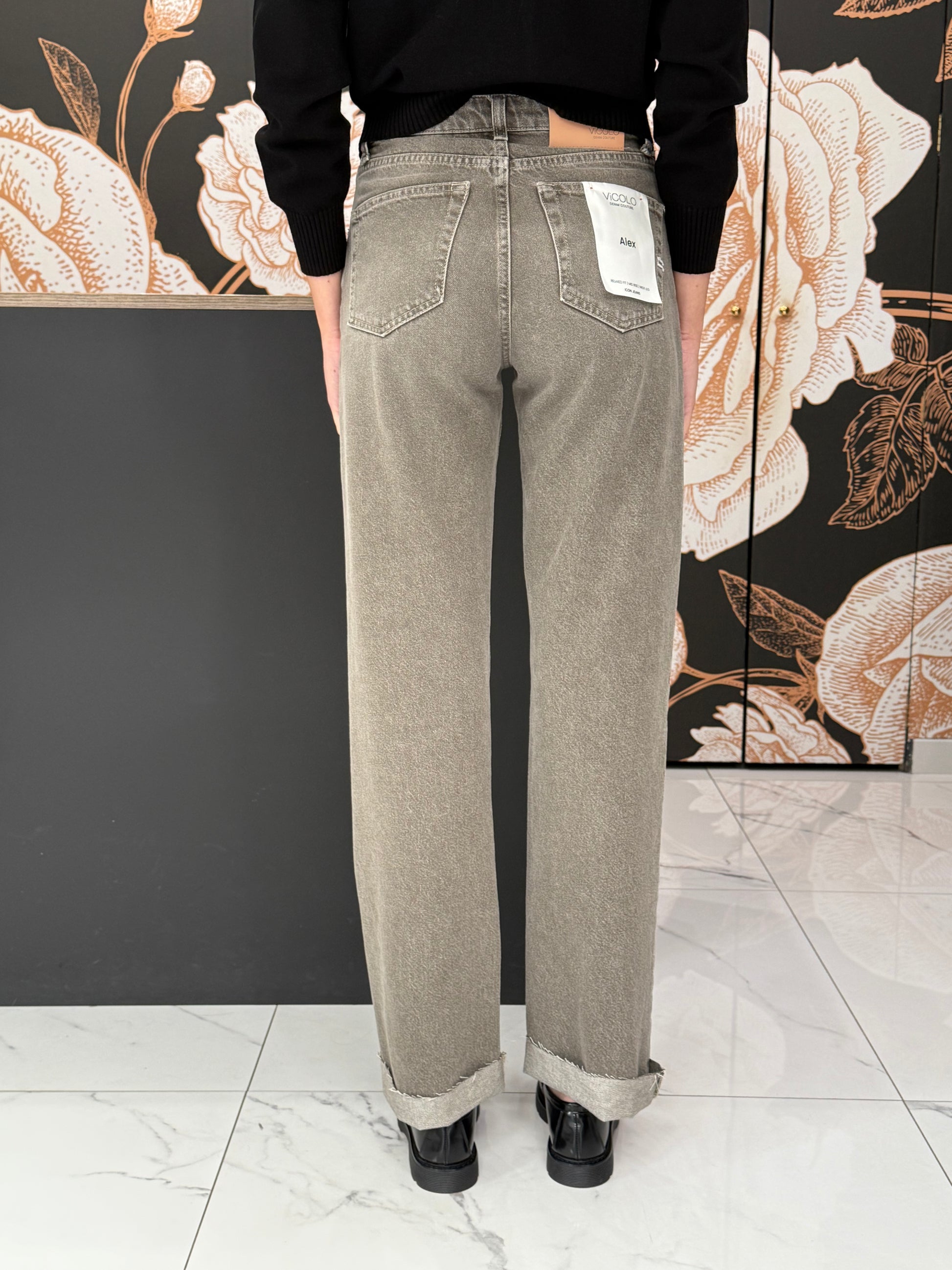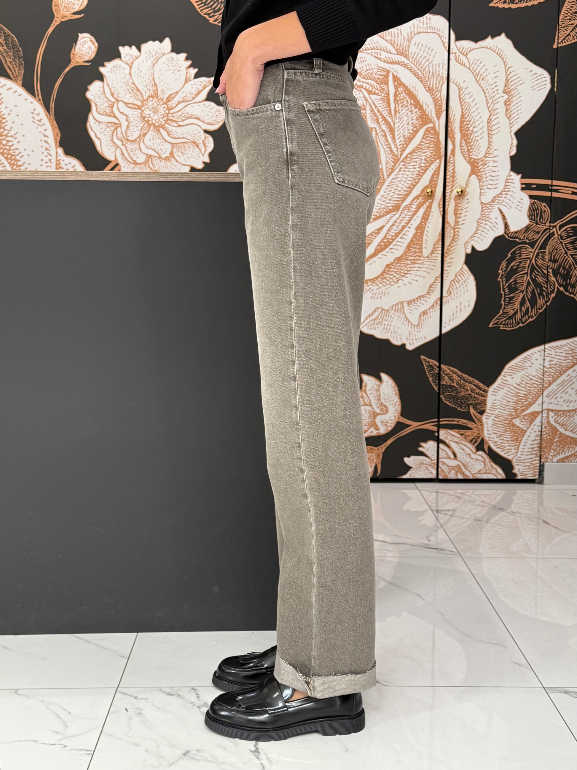 Jeans relax fit, gamba dritta, modello 5 tasche chiusura con zip e bottone. Particolarità orlo sfrangiato sul fondo.