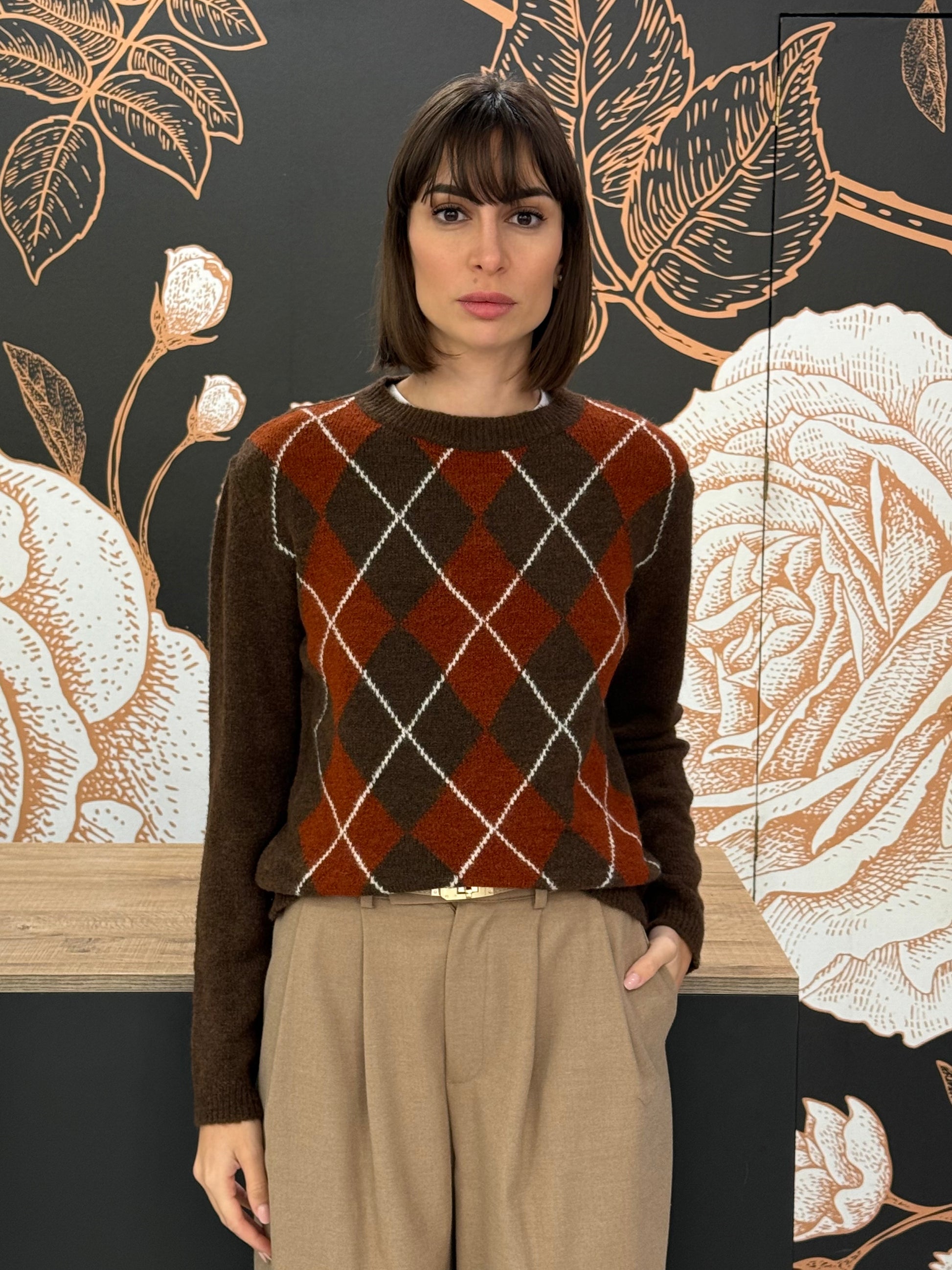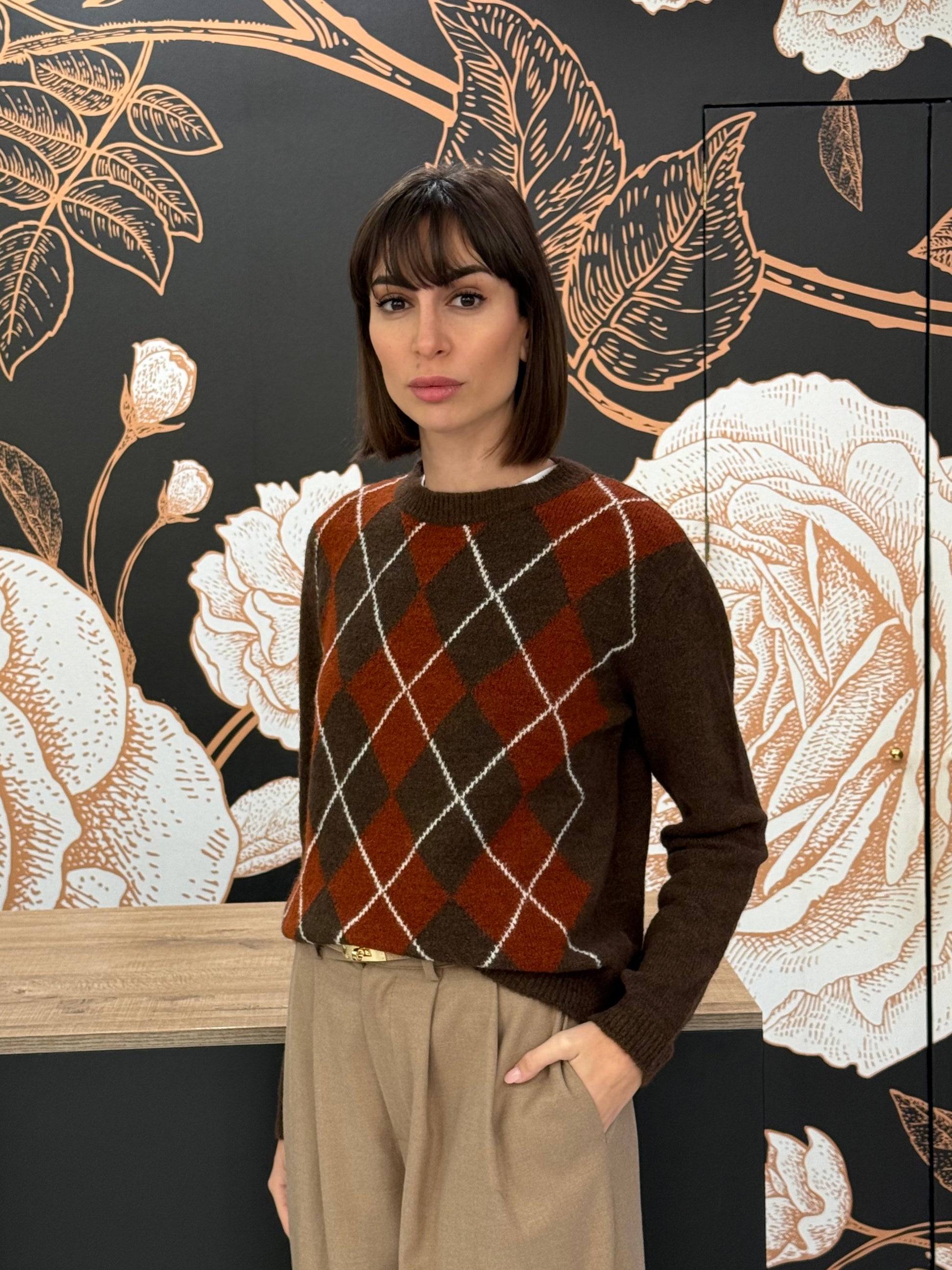 Maglia girocollo maniche lunghe motivi rombi. Colori: moro, bruciato e panna