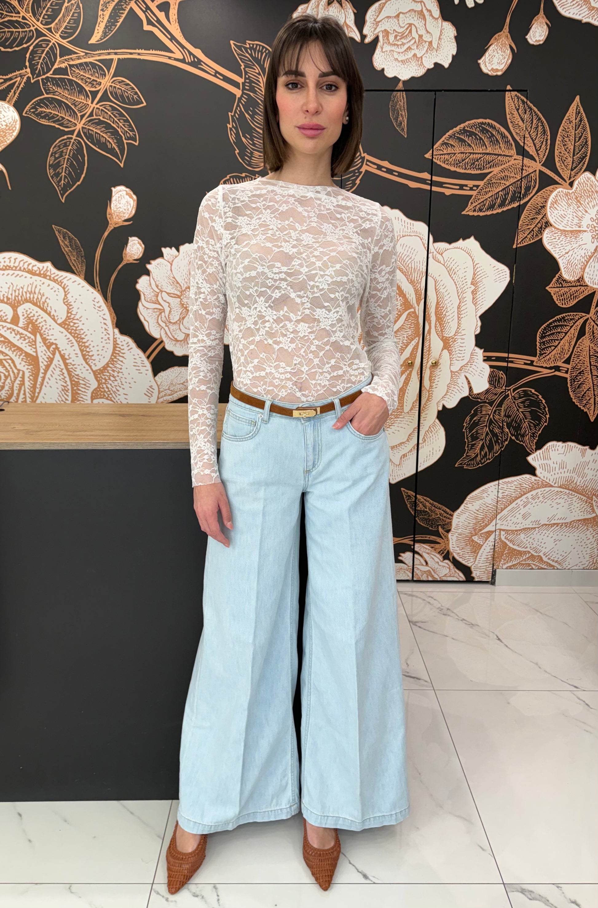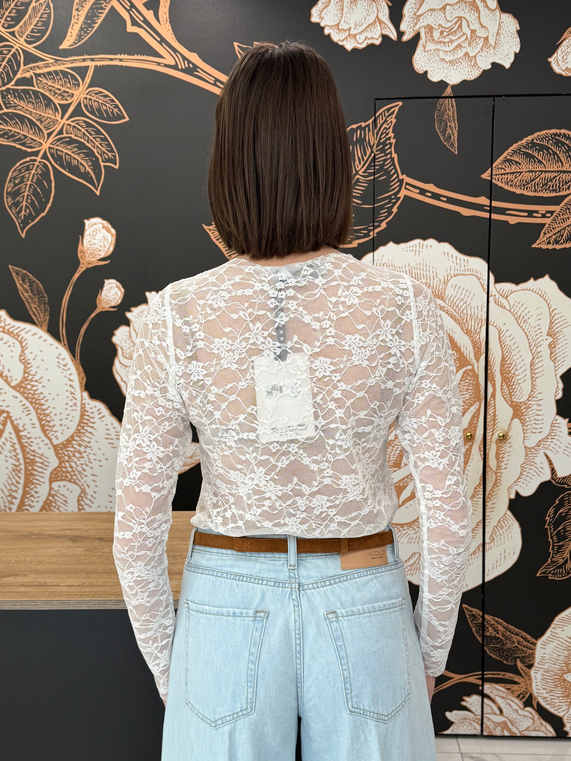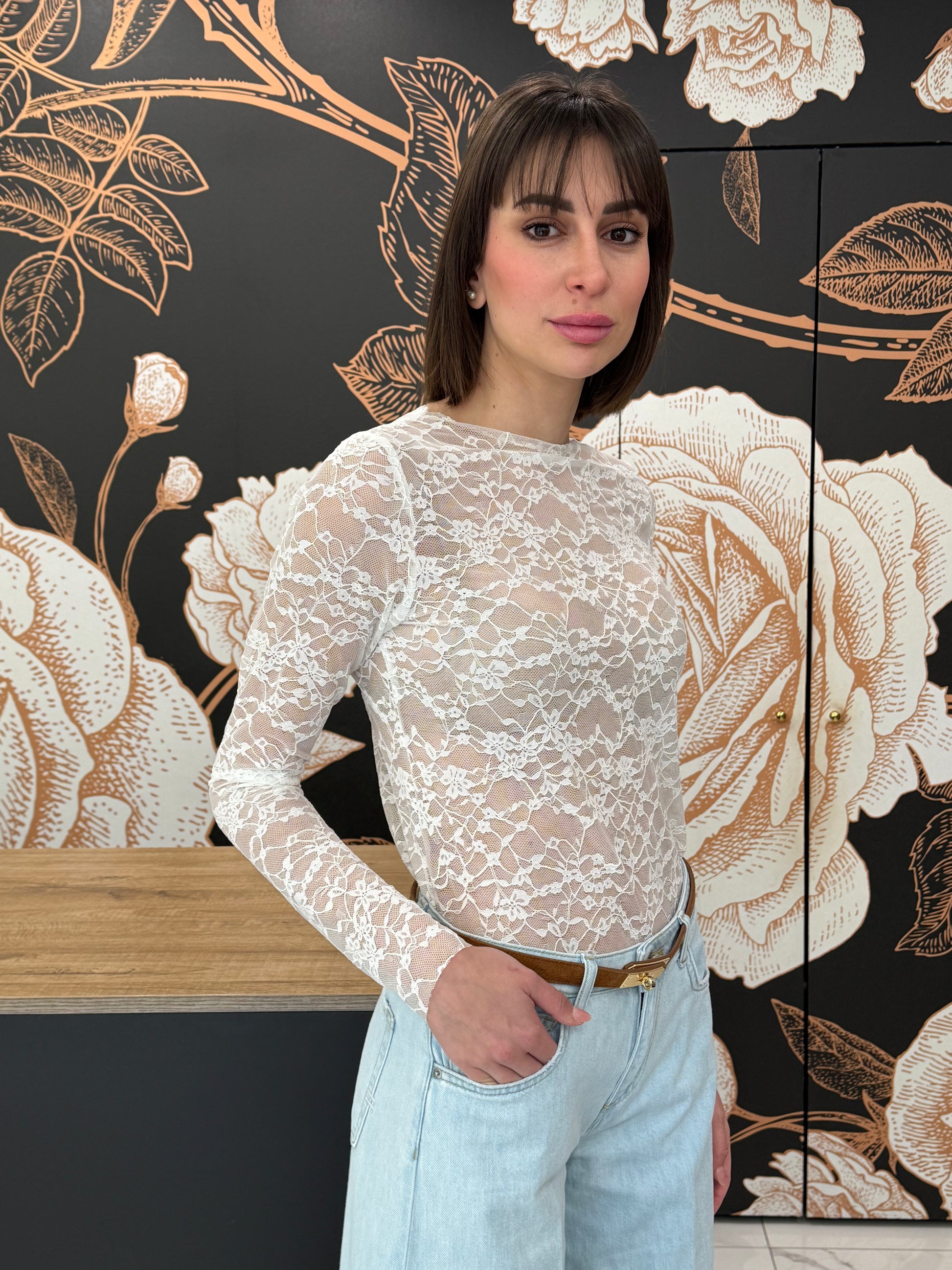 Maglia in pizzo girocollo taglio a vivo color beige chiaro.
