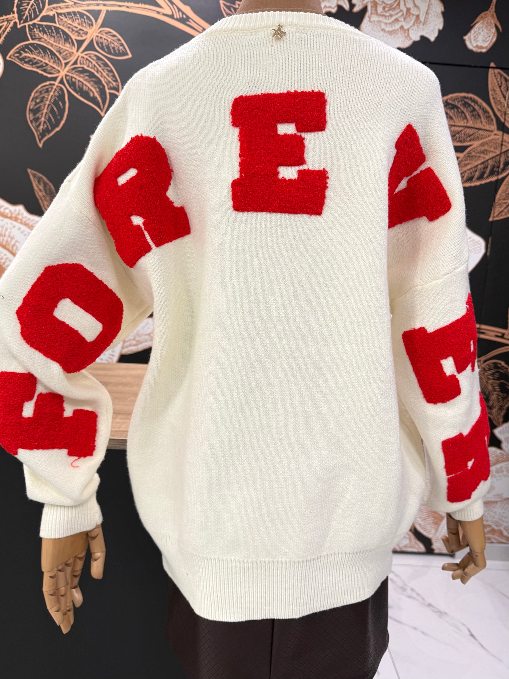 Maglia girocollo manche lunghe, panna ricamo a contrasto rosso FOREVER