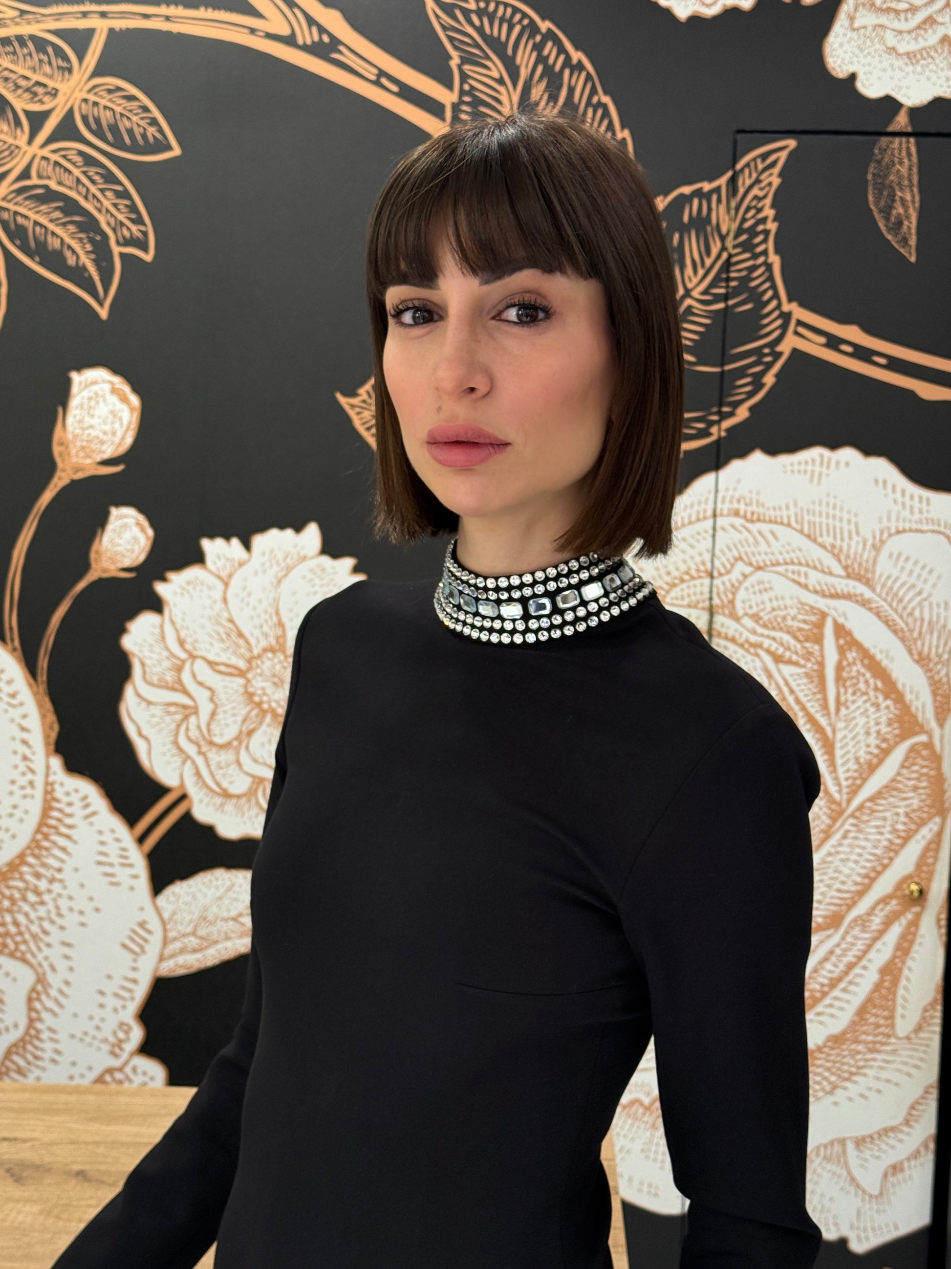 Realizzato in tessuto tecnico/stretch con finitura crystal, avvolge la silhouette esaltandone le forme. La chiusura zip invisibile sul retro garantisce una vestibilità impeccabile e un look pulito.