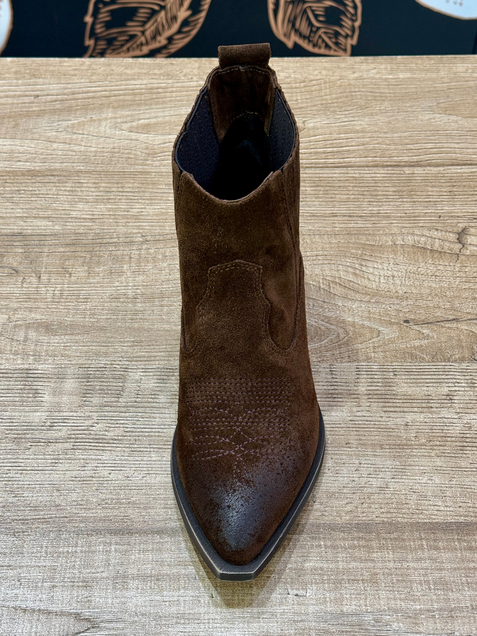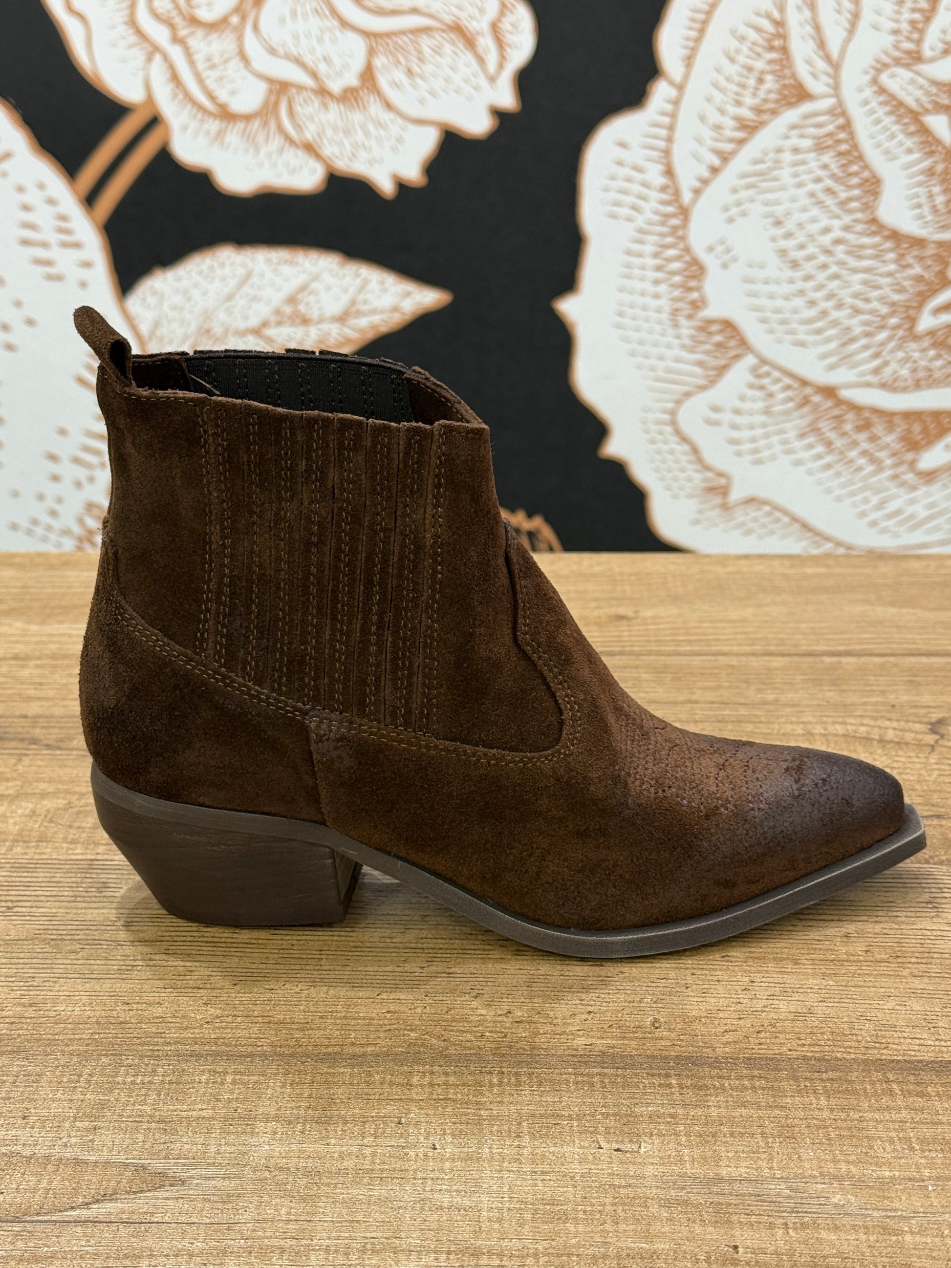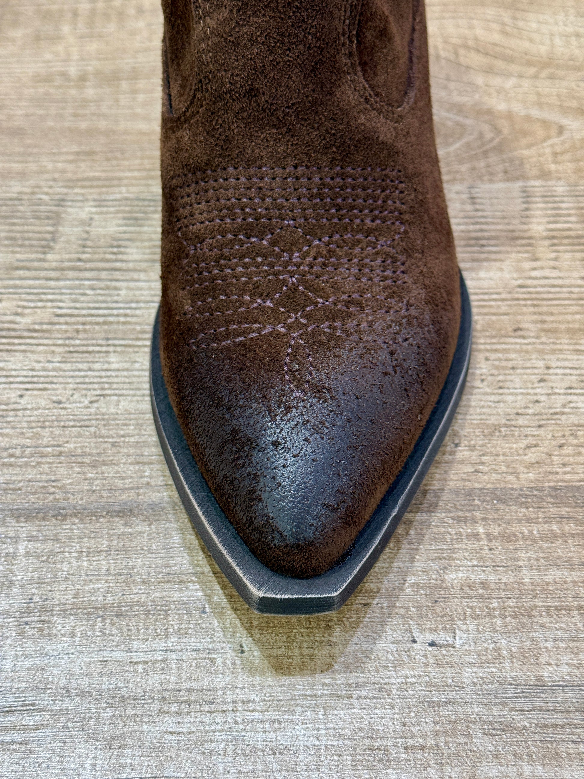 Tronchetto texano realizzato in pelle scamosciata color moro. Il design è caratterizzato dal delicato ricamo tono su tono sulla punta. Il modello è senza zip ma dotato di inserti elastici laterali sulla caviglia che garantiscono una calzata pratica. Il tacco di 5 cm offre la giusta altezza per slanciare la figura. Larghezza gambale 22 cm.