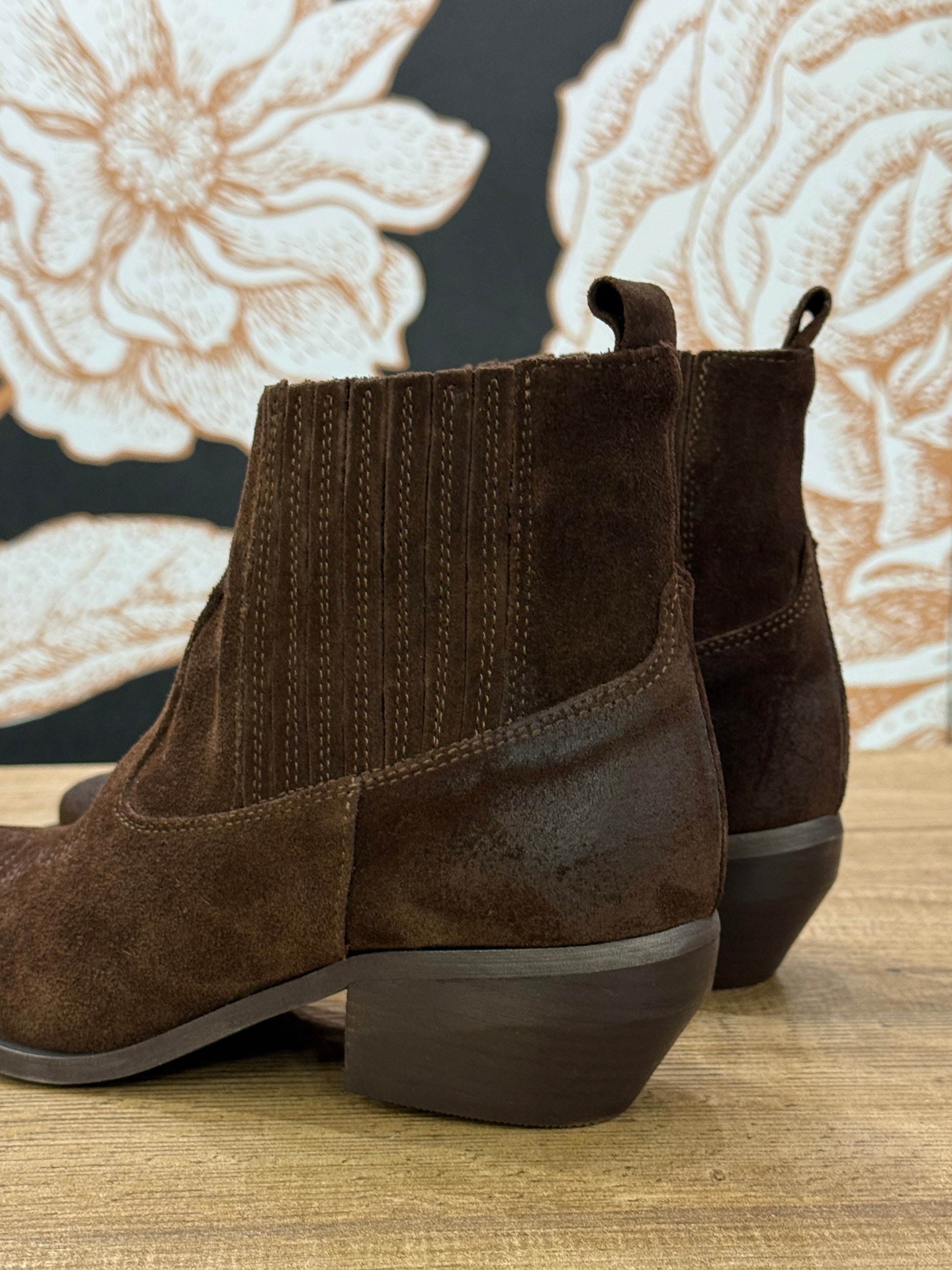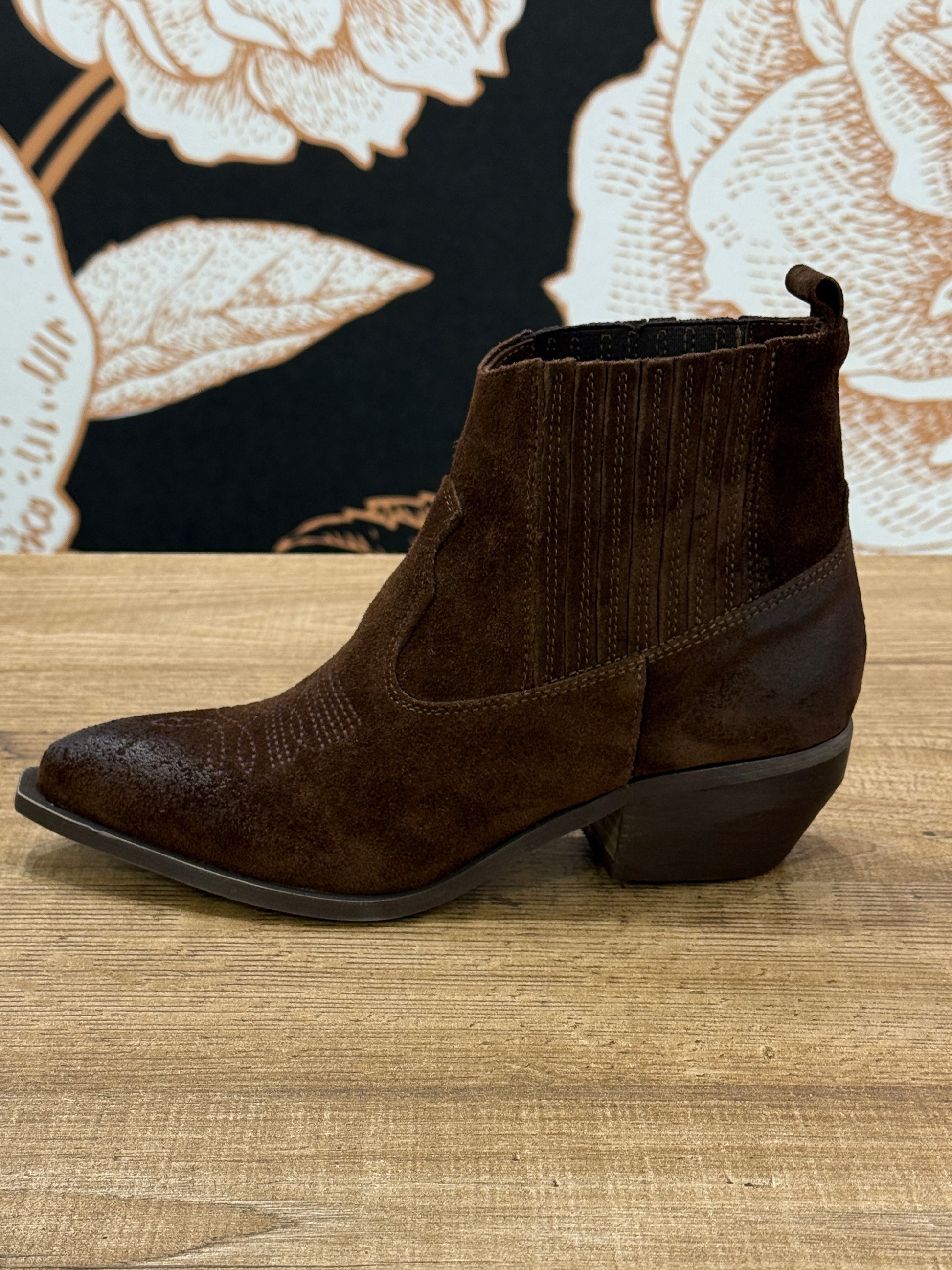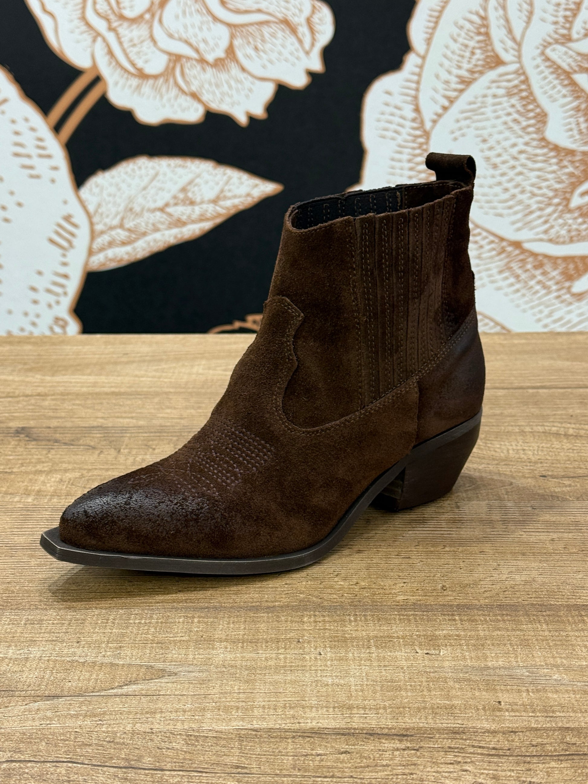 Tronchetto texano realizzato in pelle scamosciata color moro. Il design è caratterizzato dal delicato ricamo tono su tono sulla punta. Il modello è senza zip ma dotato di inserti elastici laterali sulla caviglia che garantiscono una calzata pratica. Il tacco di 5 cm offre la giusta altezza per slanciare la figura. Larghezza gambale 22 cm.